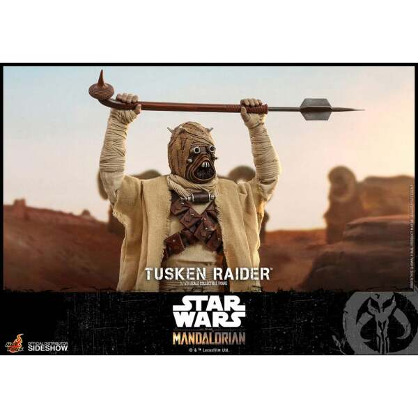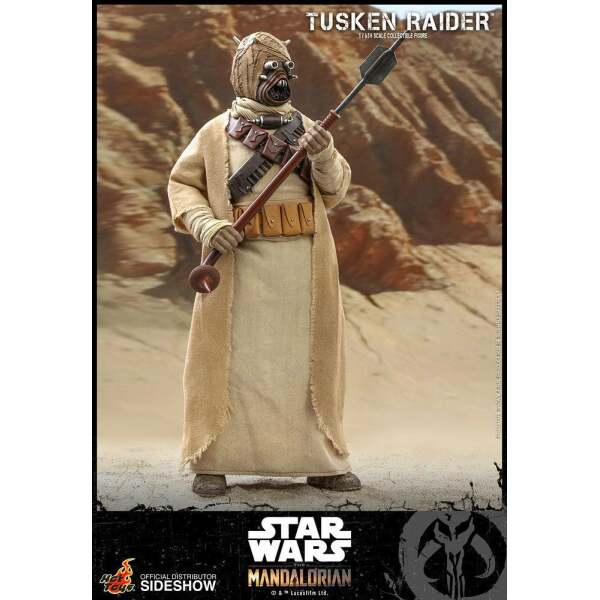 Hot Toys ha creado esta figura a imagen de los Tusken que aparecen en la exitosa The mandalorian. Además del gran trabajo de reproducción de la cabeza del morador, se incluyen sus haraposas ropas, confeccionadas en tejido real. Además, incluye cinturón y bandolera, 2 versiones del icónico gaderffii o bastón Gaffi, y el rifle cíclico tusken y unos macrobinoculares .